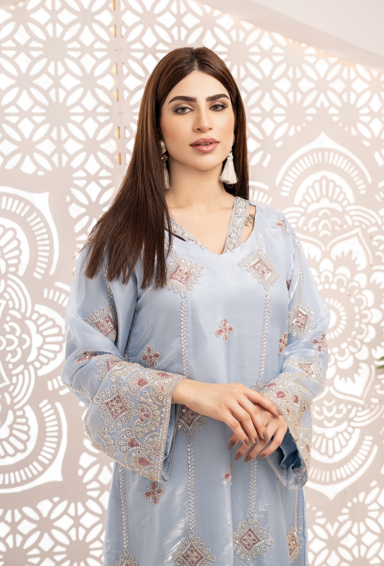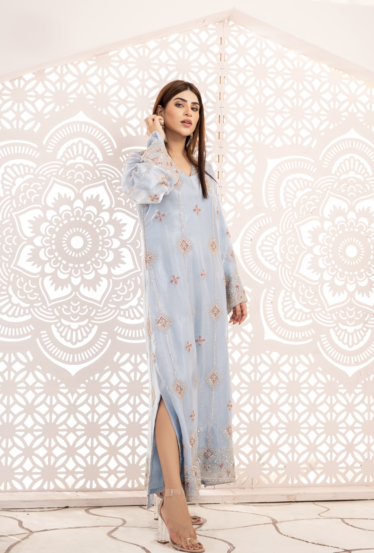 Beautiful silk kaftan with silver embroidery and it can be done in any colour.